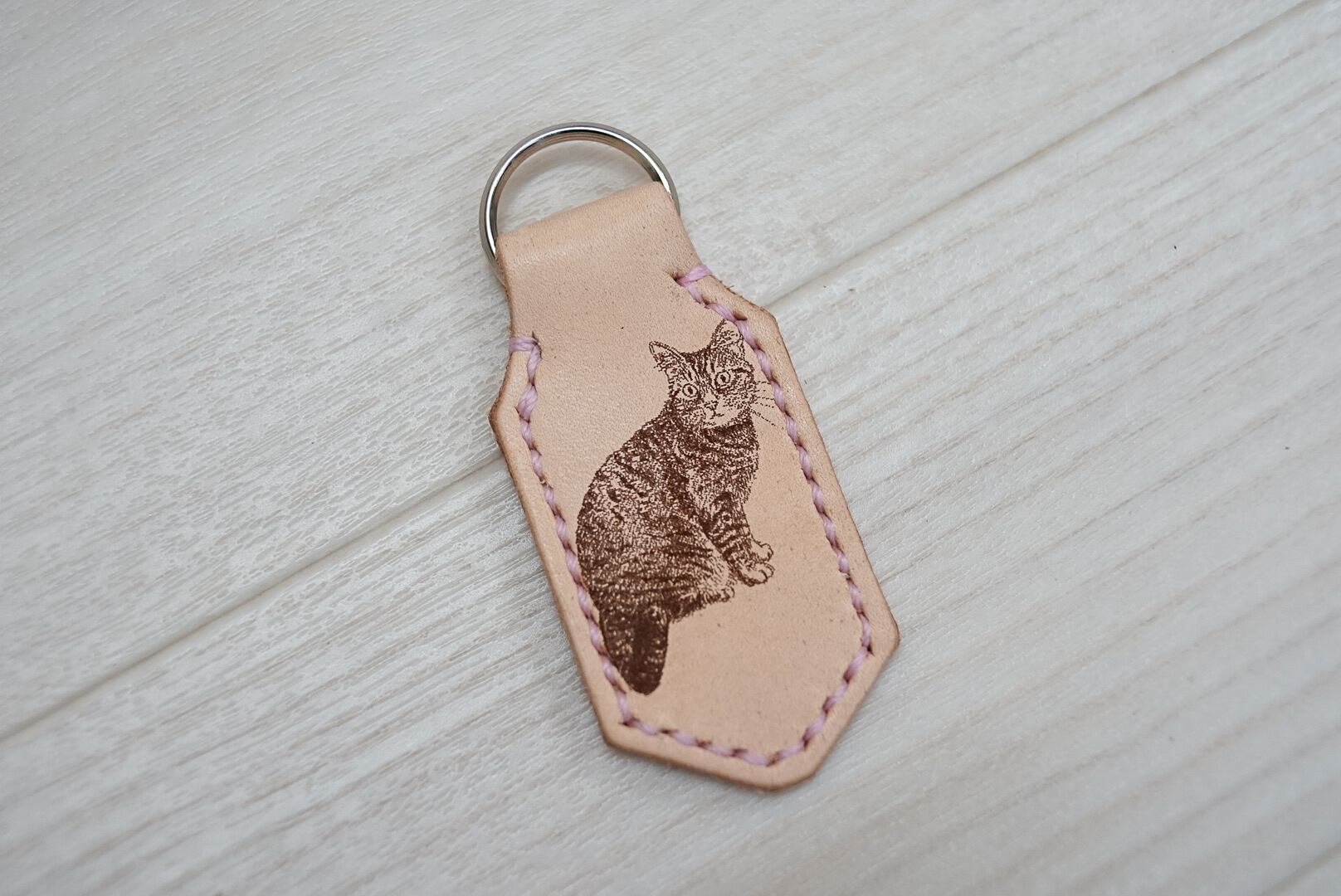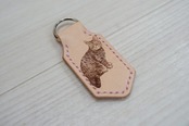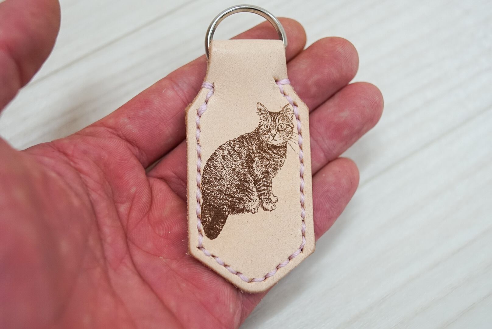 A key chain with a cat engraved on red vegetable tanned leather using a laser cutting machine.